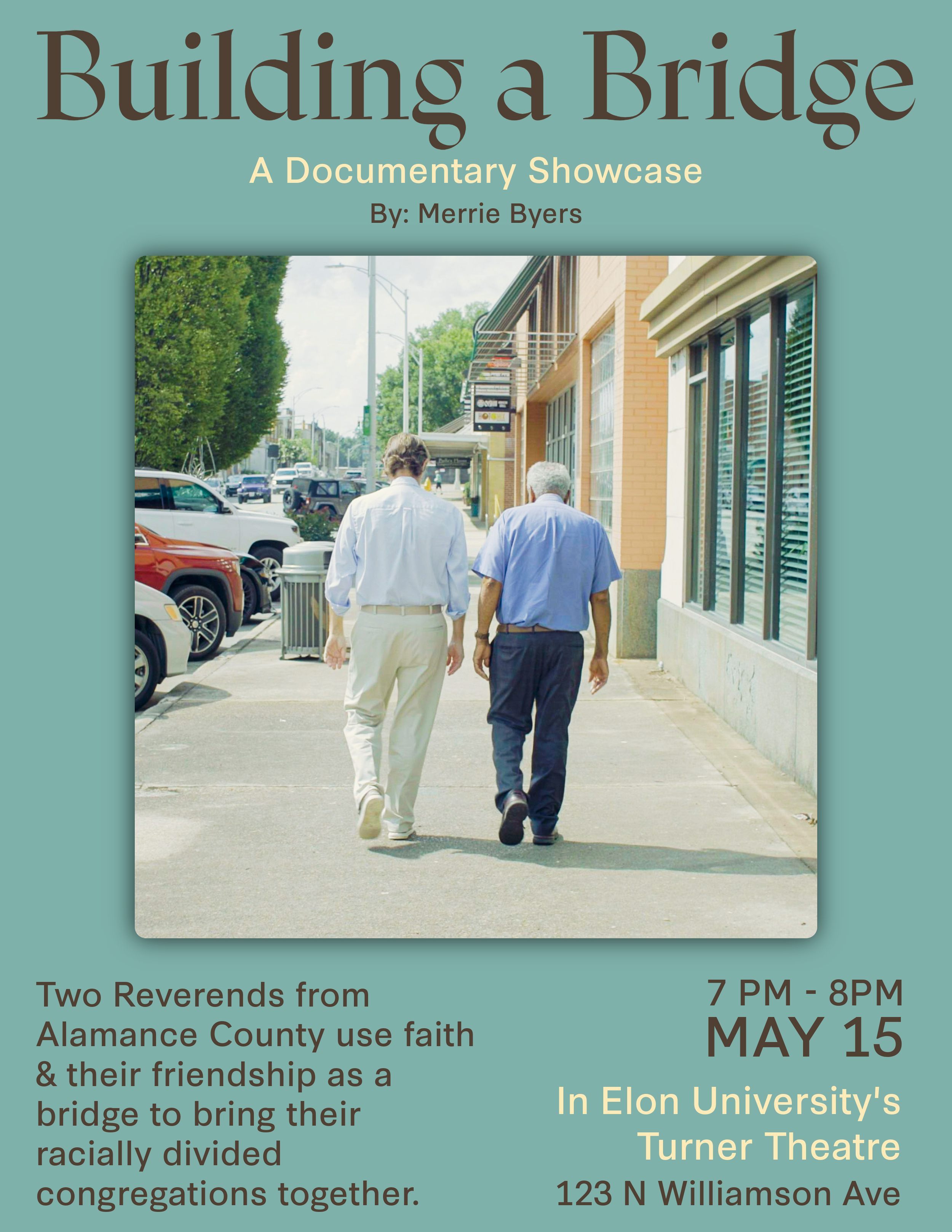 This documentary explores the leadership styles of two reverends from distinct cultural backgrounds—one who leads a predominantly white Christian church and the other who leads a predominantly Black Christian church. Their two churches sit across the street from each other in Burlington, North Carolina. Reverend Ervin Milton and Reverend Dan Ficklin have known each other for years. Their lunch conversations can last for hours as they discuss faith and their congregational differences. This documentary film will utilize interviews and original footage to examine how these faith leaders navigate the complexities of their respective congregations while maintaining their friendship. The film can contribute to a larger discussion on faith-based leadership, highlighting the importance of cultural awareness and adaptive strategies in promoting social change within congregational settings.
